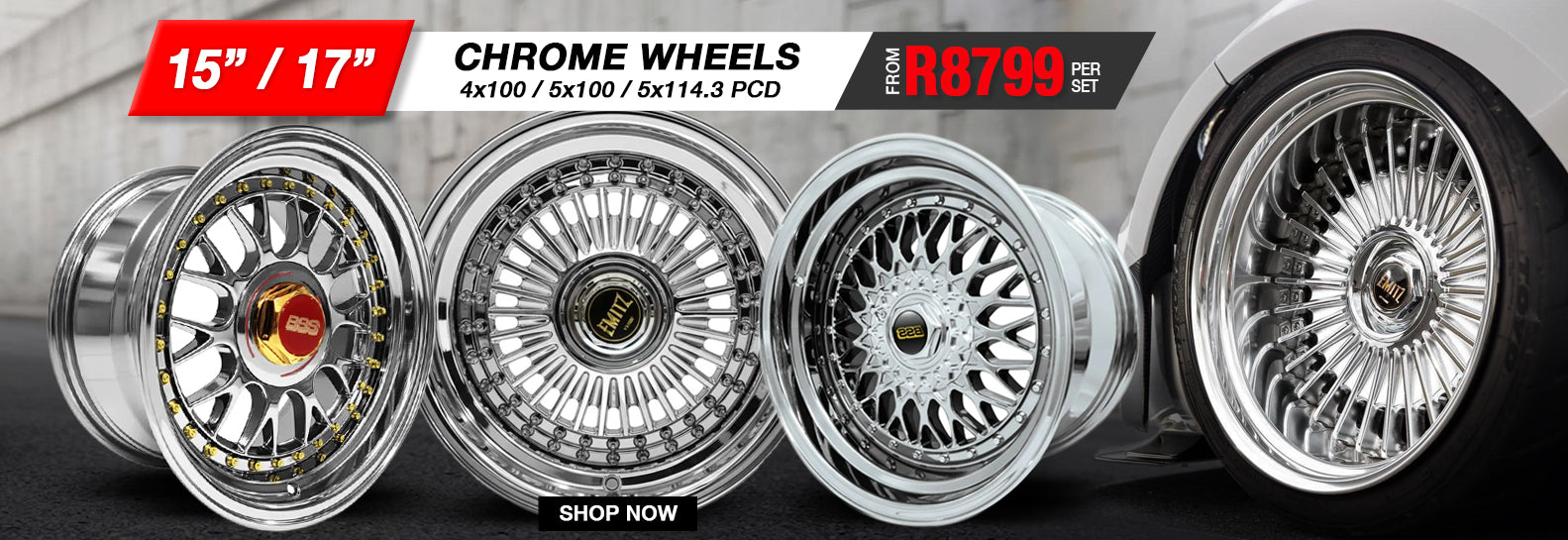 15 Inch Mag Wheel - MX5036CHR-NW Chrome Emit Wheels Narrow & Wides - (4x100/ 5x100 PCD)